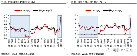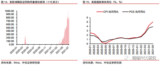 但是从即将到来的本轮紧缩周期来看,无论是市场还是美联储均会在上轮“缩减恐慌”中得到一定经验。从市场角度来看,在疫情后无限量化宽松的刺激下,近期美国货币市场流动性过于充裕,美联储隔夜逆回购用量屡创新高;同时,美国通胀高企,CPI和PCE维持高位,这也让市场对美联储Taper有了充分的准备和预期。从美联储的角度来看,由于沟通不足导致上一轮“缩减恐慌”对全球市场产生了较大冲击,本轮缩减中美联储将竭力避免相同状况发生。从美联储主席鲍威尔到达拉斯联储主席卡普兰,均表示美联储将提前尽可能长的时间与市场沟通,避免2013年“缩减恐慌”的再度上演。当前,市场对于美联储即将开始Taper的预期已经较为充分,因此我们认为美联储本轮释放Taper信号时,美债利率上行的斜率或将比上轮小。
