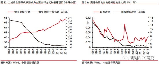 上一次大规模基建至今已有数十年历史,美国当前已经进入越来越明确的基建周期,以高速公路这一美国代表性基础设施为例,近些年的相关支出总体越来越少。随着二战后美国汽车生产价格的逐渐降低和大规模普及,美国出行也逐渐从铁路交通转向汽车出行,成为真正意义上“车轮上的美国”,随之而来的是美国铁路运营里程的不断下降和公路运营里程的不断提高。尽管美国公路运营里程长期来看不断提高,但是高速公路相关支出在财政所占比例逐年减少,反映出美国在高速公路方面的投入无法跟上经济发展的脚步。