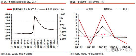 反观当前,疫情后在极度宽松的货币和财政刺激下,美国经济复苏动能强劲。疫情之后,美国经济展现出强劲的复苏势头,今年以来PMI始终位于高位,最近4个月,尽管出现经济景气边际放缓的迹象,但无论是制造业PMI还是非制造业PMI均位于60%以上的水平,远高于金融危机后复苏时期50%左右的水平。同时,当前GDP增速仍保持高位;尽管当前就业市场仍未恢复到疫情之前的水平,但是整体复苏进程向好,当前失业率已经低于6%,显著低于上一轮Taper前水平;消费方面,在美国消费结构中占绝对比例的服务消费正在稳步复苏,环比持续正增长,消费结构正由商品消费逐步转向服务消费。总体而言,当前美国经济复苏水平较上一轮紧缩周期前的经济复苏水平有显著提升。