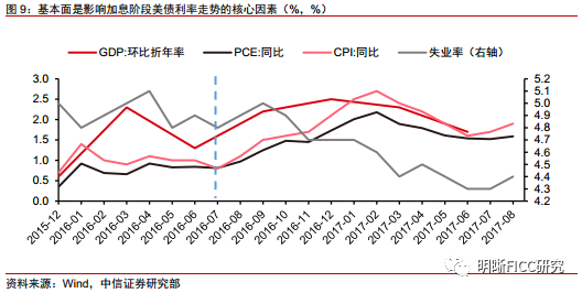 2017年6月,美联储议息会议声明显示开始讨论缩表。2017年6月14日,美联储在议息会议声明中表示,鉴于已实现和预期的劳动力市场状况和通胀,委员会决定将联邦基金利率的目标范围上调至1.0%至1.25%。货币政策的立场仍然是宽松的,从而支持劳动力市场状况的进一步加强和通胀率持续恢复到2%。同时,声明显示,委员会目前预计今年将开始实施资产负债表正常化计划,前提是经济按预期发展。美联储首次提及年内缩表,预示着紧缩周期的另一个阶段即将开启。2017年7月26日的议息会议声明显示,委员会预计将在相对较快的时间内开始实施其资产负债表正常化计划,前提是经济如预期的那样发展。