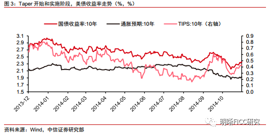 在Taper开始及实施阶段,美债收益率明显下行。在2013年12月美联储正式宣布缩减购债规模之后,10年期美债收益率在2013年底上行至高点3.04%附近,此后在2014年1月实际缩减购债规模后开始下行。随着缩减购债规模不断深入,美债收益率延续下行,至2014年10月中旬,10年期美债收益率已下行至2.15%附近,下行幅度近90bps。拆分Taper实施阶段的美债收益率来看,通胀预期在2014年8月之前都未发生明显变化,美债收益率的下行主因还是实际利率下行所致,2014年8月之后,通胀预期开始下行,实际利率反弹后再次快速下行,共同推动美债收益率下行。总体而言,Taper实施阶段,美债收益率明显下行是市场对于Taper退出后经济复苏不可持续的担心所致。但实际上,除了2014年第一季度外,美国经济在Taper开始及实施阶段表现并不弱。