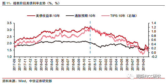 2018年12月起,美国经济复苏出现放缓迹象,12月零售额出现大幅下滑,环比下降1.2%,创2009年9月以来最大降幅。美联储在12月的议息会议上依然选择继续加息,市场对于经济的担忧开始升温,实际利率和通胀预期同时开始下行,带动美债利率开始走低。1月美联储议息会议纪要显示一些下行风险有所增加,包括全球经济增长放缓幅度超过预期的可能性、英国脱欧相关的不确定性,国际贸易紧张局势升级以及联邦政府进一步延长停摆的可能性等。此后,由于美国经济趋弱、政府停摆、中美贸易摩擦以及英国脱欧等因素,美债利率在实际利率的带动下快速下行,到2019年9月结束缩表时,美债利率已经达到1.5%以下,下行幅度超170bps。