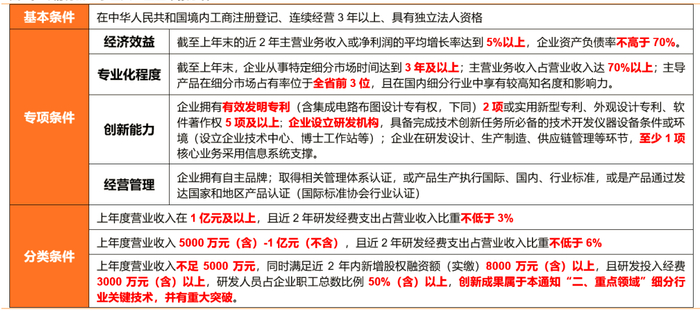 根据工信部《关于开展第三批专精特新“小巨人”企业培育工作的通知》,专精特新“小巨人”企业主导产品应优先聚焦制造业短板弱项,符合《工业“四基”发展目录》所列重点领域。