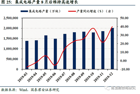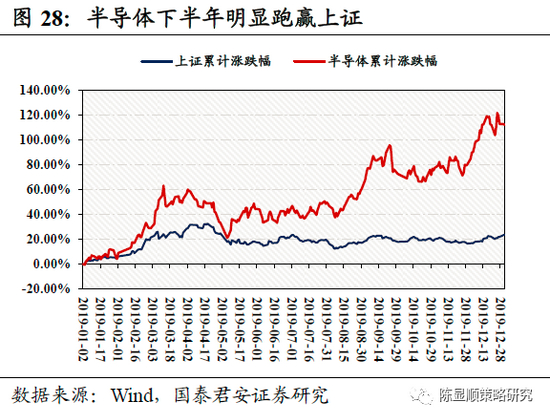 从8月初国家大力支持集成电路产业政策出台后,国产集成电路产量飞速上涨,从8月起集成电路产量同比增速突破20%,且8月后同比增速一直保持在20%以上,在12月更是达到了40.28%。集成电路产量的快速提升意味着集成电路、半导体、芯片产业的良好未来,也间接助推了半导体产业在2019年8月后的快速上涨,从8月15日至12月31日,半导体指数上涨了28.1%。