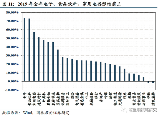 2019年行业整体迎来普涨,电子行业登上桂冠。2019年一共有28个申万一级行业迎来上涨,其中电子行业因半导体二级行业的强劲表现以73.77%的涨幅位列所有行业第一,食品饮料、家用电器、建筑材料分别以72.87%、56.99%、51.03%的涨幅分列2、3和4位。而建筑装饰、钢铁行业领跌,跌幅分别为-2.12%和-2.09%。