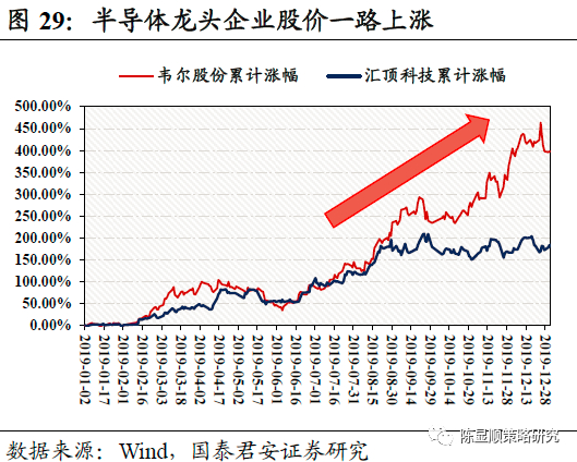 此外,从8月中下旬开始由于新出台的《新时期促进集成电路产业和软件产业高质量发展的若干政策》的刺激作用,以半导体、芯片为代表的科技股开始快速上涨,8月15日至12月底,半导体指数涨幅达到44.80%远高于同期上证指数8.32的涨幅,可以发现韦尔股份、汇顶科技等半导体、集成电路龙头企业在2019年下半年一路上涨。