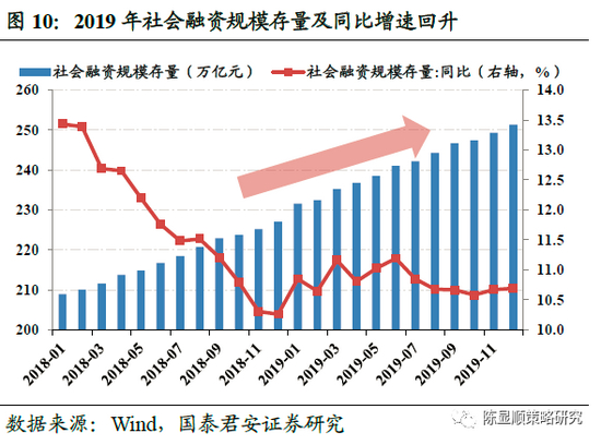2019年中国货币供给量总体稳健增长,年末增长创新高。2019年由于受到中国经济下行压力,因而政府加强了逆周期调节,为了避免过于宽松的货币政策所带来的金融风险,央行首次提出了广义货币M2和社会融资规模增速与国内生产总值名义增速相匹配,不再设定具体数值的货币增速目标。2019年上半年中国M2增速保持在8.5%以上,高于2018年的平均水平,社会融资规模存量同比增速保持在10%以上,其中2019年12月新增社融2.1亿万亿元,M2同比增长8.7%。由此可见,货币政策由2018年的“去杠杆”转向了边际上的宽松,流动性的释放极大地改善DDM分母端,A股市场由此突破重围,绝地反击。