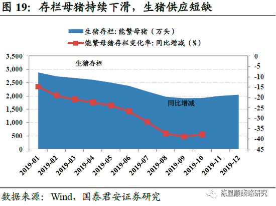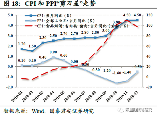 CPI和PPI“剪刀差”的扩大是因为影响二者的因素有所不同。CPI涨幅居高不下主要受猪肉价格上涨的影响。2019年以来,猪肉价格大幅上涨,带动了物价水平整体提升,但是核心CPI并没有上涨,食品项中的烟酒和蔬菜并没有涨价,非食品项没有涨价。而猪肉价格大幅上涨的原因,又在于环保政策的出台使得猪场拆迁,养殖户去产能情绪高涨,存栏母猪持续下滑,生猪供不应求使得猪肉价格高涨。从PPI看,持续走低主要是受油价回落和大宗商品价格下跌的影响。PPI的下降实质上是中国内需不足的反映,内需不足引起大宗商品价格下跌,导致PPI走低。本轮通胀不是典型的通胀,有“类滞胀”的感觉,经济走下坡路,同时物价飞涨。