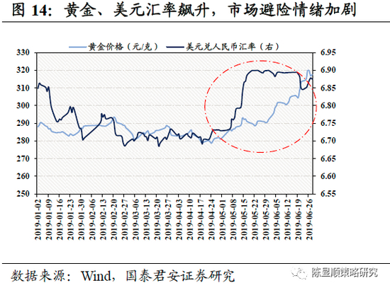 在此阶段以白酒为首的食品饮料行业走出了逆市场行情。此时中美关系恶化的负面冲击迅速在市场上扩散,可以发现从5月初起,人民币汇率协同黄金一路迅速飞涨,显示了当时避险情绪主导了市场,因而,资金更加青睐以白酒为代表的低风险特征的股票。在全行业普跌的行情下,例如贵州茅台和五粮液的高端白酒个股表现亮眼,从5月6日至6月底,贵州茅台股价上涨10.22%,五粮液涨幅更是达到了30.28%,而同期上证综指仅上涨了2.49%。