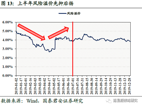 7月1日至8月13日,中美摩擦僵持,导致风险偏好情况持续恶化。从7月开始人民币兑美元汇率一直维持在高位运行,人民币汇率在7月上旬小幅在6.87高位附近震荡,而随着8月1日,美国总统特朗普表示,将于9月1日启动第四轮对华制裁性关税,对价值3000亿美元的中国产品加征10%的关税,人民币兑美元汇率一路飙升,8月5日在岸离岸人民币双双破“7”,同日美国宣布将中国列入汇率操纵国,市场恐慌情绪扩散,贸易战和汇率战的双重负面影响使得市场的风险溢价站上了高峰,风险偏好处于历史低位,影响了DDM模型分母端。