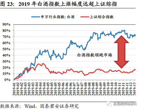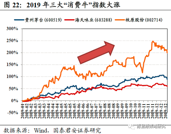 经济下行压力下,追求具有确定性的必选消费。经济下行往往会带来股市的下跌或震荡,因此资金在不确定性的市场中更倾向于追求确定性。必选消费领域是防御性投资的主要方向,在经济走下坡路的情况下,必选消费体现出逆周期特征,与宏观经济景气度相关度较低,增速稳定,因此成为机构投资者重点拥抱的行业。具体来讲,必要的消费品如食品饮料、烟草、居家用品、主要用品、零售商等都属于必选消费领域;可选消费包括媒体、酒店餐饮与休闲等。必选消费中的食品饮料自9月份起上涨幅度高达70%,19年全年上涨幅度远超大盘。