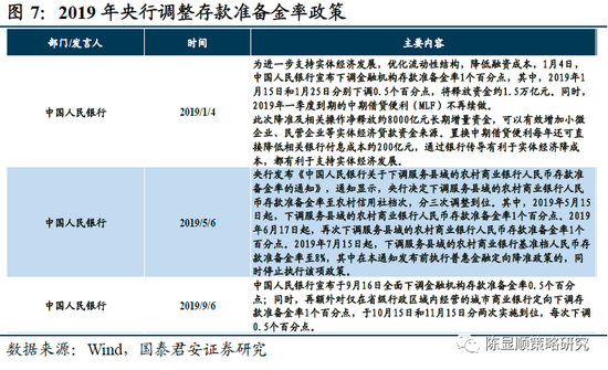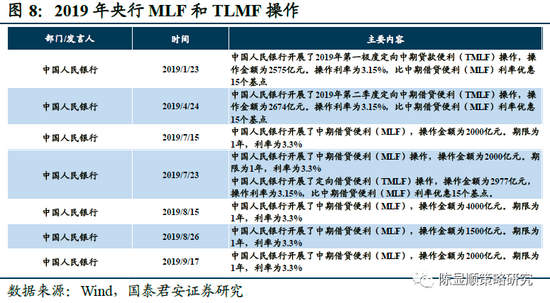 19年货币政策趋于宽松,下调存款准备金政策叠加MLF和TMLF操作。2019年中国实施针对性存款准备金政策。2019年全年,央行一共三次下调存款准备金率,央行的降准政策在保障社会总资金流动性的前提下,同时有针对性地对于不同等级的金融机构实施不同的存款准备金率要求,对于中小银行实施较低的存款准备金率,从而能够在防范金融风险的前提下,更好地服务于中小微企业,为其提供所需要的流动资金。除此之外,2019年中期借贷便利(MLF)投放量总体维持平稳,全年MLF投放量为36900亿元。