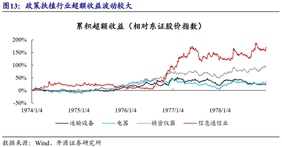 (1)景气度是股票表现的前提,政策之外关注高景气行业:在1968-1984共17年的时间里,日本股市涌现了大量与产业政策无关的高景气行业机会:如1970-1972年的海运业,1973年的矿业,1973-1978年的食品和空运业等。与此同时,政策鼓励的行业也是业绩兑现下开始大幅跑赢市场,例如石油危机后打开海外市场的日本汽车产业在1973年之后才开始在股价上表现出超额收益。另外,即使是政策压制的行业,只要景气度高仍能跑赢,例如1977年后主动限制出口的日本家电行业,在彩电和VTR等全球领先的产品带动下股价继续走高。