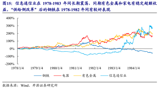 值得一提的是,信息通信业的高涨幅集中在1983-1984年实现,在1978-1982年的近5年时间中都在横盘震荡,而有色金属和家电的表现则更为稳定。此外,“供给侧改革”中的钢铁在1978-1982年间有较好表现。