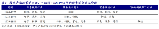 值得注意的是,日本转型期间的产业政策并非一成不变。剔除掉1985年开始的泡沫经济时期,根据日本产业政策的变迁,我们将1968-1984年间的日本产业转型过程分为三个小阶段: