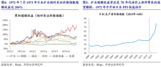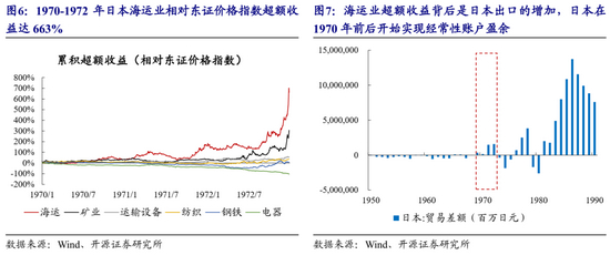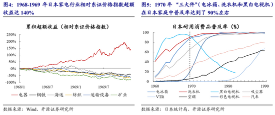 这一阶段的股市没有持续的主线,家电、海运和矿业先后领跑,每个行业背后都有各自的景气线索:1968-1969年日本家电行业超额收益背后是整个60年代日本家电的快速普及,到1970年黑白电视、洗衣机和冰箱在日本渗透率已达90%左右;1971-1972年海运业超额收益背后是日本扩大出口成为了经常性账户盈余国家;1973年矿业(主要是煤炭和石油开采)大涨背后是1970年代开始油价上涨带动的通货膨胀。