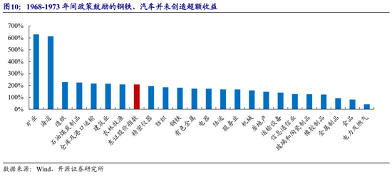 2.1 第一阶段(1968-1973,转型前):高景气度的家电、海运和矿业先后领跑,政策鼓励的钢铁和汽车行业并未创造超额收益