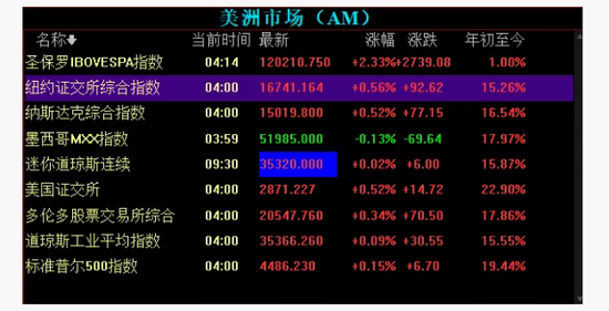 隔夜美洲股市普涨,仅墨西哥MMX指数微跌0.13%。在基建计划利好消息的刺激下,周二美股三大股指齐收涨,纳指与标普500指数创历史新高。纳指史上首次站上15000点关口。中概股普遍上扬。