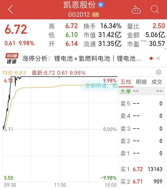 受消息刺激,凯恩股份在开盘后持续拉升,最终以涨停收盘。