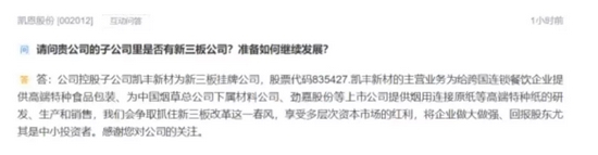 9月3日上午,凯恩股份在投资者互动平台上表示,公司控股子公司凯丰新材为新三板挂牌公司,股票代码835427。凯丰新材的主营业务为给跨国连锁餐饮企业提供高端特种食品包装、为中国烟草总公司下属材料公司、劲嘉股份等上市公司提供烟用连接原纸等高端特种纸的研发、生产和销售。“我们会争取抓住新三板改革这一春风,享受多层次资本市场的红利,将企业做大做强、回报股东尤其是中小投资者”,凯恩股份称。