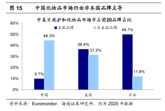 国际品牌主导我国化妆品市场,国货品牌细分领域突围。“颜值经济”时代,化妆品行业正日益发展壮大。根据Euromonitor的数据,2020年中国洗护与化妆品市场规模为5199亿元,预计2021年可达到5879亿元。当前国内化妆品市场中,国际品牌占据主导地位:在市占率前20中,国际品牌合计为44.3%,远高于国内品牌的9.7%。与国内市场相比,日本和美国的化妆品市场中,本土品牌更受消费者喜爱,市占率前20中本土品牌分别占据49.7%/36.4%的市场份额,而非本土品牌市场份额为11.8%/31.2%。从市场定位来看,以零售价值为指标,国际厂商垄断我国高端化妆品市场,2020年欧莱雅、雅诗兰黛、LVHM分别以18.4%、14.4%、8.8%的市占率位列前三,国内品牌阿道夫和贝泰妮以3.0%和2.3%的市占率跻身前十。但在大众化妆品市场,国内品牌已经崛起,百雀羚、伽蓝集团、上海佳化、上海上美分别以3.9%、3.7%、2.3%、1.9%位列市场份额前十甲。