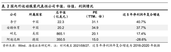 国内品牌市场份额和话语权的提升主要得益于持续提升的产品功能性、科技力和文化价值,为国产品牌树立了品牌壁垒。以李宁为例,20年8月李宁品牌发布减震回弹技术及“绝影弹速”、“绝影Essential”两款专业马拉松产品,以满足国内消费者对跑鞋经济性、专业性的追求;同时,绝影弹速跑鞋首发配色版本为“紫气东来”,承载着给予跑者的寓意和祝福,亦体现出品牌方对中华文化的传承意识,受到广大跑友的追捧。与李宁相似,361°在2021年发布了首款碳板跑鞋,回弹出众,耐久出色,国内品牌的产品功能性和科技感不断增强,在实惠的定价策略下性价比凸显。随着国内品牌在产品科技力、功能性、口碑形象上加速进步,打造核心竞争力,我们认为头部国货品牌的崛起有望带动一众本土运动鞋服品牌从中低端市场迈入高端市场。国内运动鞋服品牌李宁和安踏在市值上虽落后于海外龙头耐克,但安踏市值已经接近另一海外巨头阿迪达斯,并且两家国内企业保持了较高盈利增速,正逐步追赶海外龙头企业。
