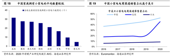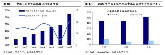 小家电行业中国产企业占主导地位。当前,90后-00后的消费者群体崛起,小家电迎合了年轻一代的消费个性化和对品质生活的追求,行业呈现上升趋势,观研天下统计显示,2020年我国小家电市场规模已破4000亿元。在当前主要国家中,各国本土企业占主导地位。根据Euromonitor 的数据,以零售量为指标,2020年中国小家电市占率前十中,国内企业市占合计达43.6%,远高于非本土企业的9.8%。日本市场和美国市场中,市占率前十中本土企业合计分别为51.6%/44%,而非本土企业仅为7.0%/4.5%。虽然本土企业在我国小家电市场处于领先地位,但是据2020年前瞻产业研究院援引奥维云网数据显示,中国家庭拥有小家电数量为9.5个,距离日本家庭的16.5个和美国家庭的31.5个仍有较大差距,国内市场增长空间广阔。