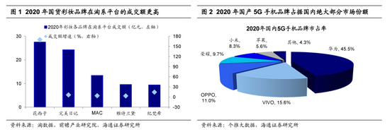 “国潮热”澎湃不息,国货正快速崛起。长期以来,比起国产品牌,多数消费者更加青睐进口品牌。自2018年国内消费市场开启了“国潮元年”以来,众多国产品牌便凭借对传统文化的挖掘和对新消费趋势的把握,带领国潮文化乘风破浪,成为当下最火热的潮流之一,消费国货的认同感、亲和价格带来的价值感、创新赋予的满足感、质量放心的安全感正牢牢抓住消费者的心。近年来,彩妆、智能手机、运动服装等多个领域中,国潮消费已经崛起:在颜值经济的推动下,国人越发注重自身个人形象的提升,彩妆市场热度不断攀升。根据淘数据和前瞻产业研究院的数据显示,近三年进入天猫彩妆成交品TOP20榜单中,国货占据半壁江山,尤其完美日记和花西子“异军突起”,在2020年淘系平台的市占率超过国际品牌,成为唯二成交额超20亿元的品牌,打破海外化妆品长期霸占销量榜单的格局。在智能手机领域,随着火热的5G建设不断推进,新一轮换机潮确定性进一步增强,国产品牌优势明显。根据中国信息通信研究院的数据,2020年国内手机出货量当中,国产品牌占比达87.5%,且2021年上半年继续上升至89.2%。今年上半年“新疆棉”事件扭转了国内运动服装市场对海内外运动品牌的态度,李宁、安踏等国牌不负众望、保持强劲的增长势头,2021年上半年李宁公司营收同比增长65.0%至101.97亿元,归母净利润同比大涨187.2%,达到19.6亿元。