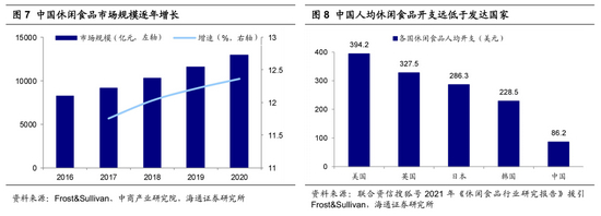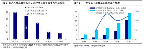 休闲食品中,国产品牌从细分领域掘金。消费者对于生活品质追求逐渐提升,中国休闲食品行业实现快速扩容,据锐观网援引《中国食品工业年鉴》的数据,预计2020年我国休闲零食市场规模将达27281亿元,预计到2025年有望突破4万亿元。我国休闲零食市场中,2020年市占率前20里国产品牌份额占比已达16.3%,高于国外品牌的13.4%。但若对标发达的日本休闲零食市场,国货还有较大提升空间。日本前20大休闲食品品牌中本土市占合计达41.9%,远超非日本品牌的9.6%。并且,根据产业信息网援引智研咨询数据,当前我国休闲食品人均消费水平为2.15kg/年,尚不足日本的一半,国内市场潜力较大。许多国牌零食在广阔市场中悄然崛起,根据21年中商产业研究院的数据,国内品牌在坚果炒货、卤制品和膨化食品的CR5中占据更多市场份额。