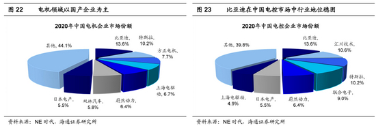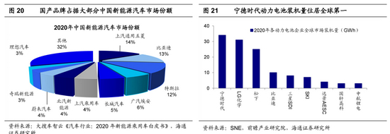 进一步深入新能源车产业链来看,中国厂商在动力电池、电机、电控多个环节逐步成熟。动力电池行业中,前瞻产业研究院援引SNE数据显示,宁德时代稳居行业龙头。2020年全球动力电池装机量137GWh,宁德时代、LG化学、松下分别以34GWh、31GWh、25GWh占据65%的市场份额,在全球占据主导地位。国内市场中,据前瞻产业研究院援引中国汽车动力电池产业创新联盟数据,宁德时代一家独大,2020年市场份额达到49.98%。电机、电控领域虽以国产企业为主,但尚未出现一家独大的行业龙头。目前电机整体市场正朝电机、减速箱、逆变器集成的“三合一”方向发展,根据NE时代的数据,国内“三合一”电驱动占电驱动整体装机量比重从2020年的37.3%上升至2021年上半年的51.2%,国内厂商表现亮眼,比亚迪、方正电机市场份额达13.6%/7.7%、分别居1、3位。电控市场中,比亚迪行业地位稳固,汇川技术依靠造车新势力打入市场。2020年比亚迪、汇川技术电控销售量为18.4万套、14.3万套,超过特斯拉的13.8万套。从产业链整体看,在政策的全面支持下,国内新能源车相关企业技术逐步成熟,伴随国内和全球新能源车渗透率不断提高,国内厂商有望继续扩大市场份额。