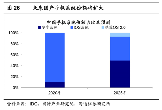 我国在操作系统和芯片两个关键领域亟待突破。今年6月,华为自主研发的鸿蒙OS2.0系统发布,是打破西方操作系统壁垒的里程碑。根据前瞻产业研究院援引IDC数据,2025年鸿蒙OS2.0操作系统将占我国手机操作系统市场的6.7%。虽然距安卓系统和IOS系统的49.9%和43.7%的占比仍有差距,但伴随鸿蒙系统的优化,未来将会应用各类智慧物联产品,生态圈空间广阔。在5G芯片方面,中国是5G芯片最大的市场,但我国手机芯片市场严重依赖进口,联发科和高通占据主要份额,据前瞻产业研究院援引ICInsights数据,我国芯片自给率仅为15.9%。美国对中国5G芯片及企业实施贸易制裁,倒逼5G芯片的研发和国产替代,紫光展锐的T770已是全球首款6nm EUV 5G芯片,5G芯片专利数不断累积,国产芯片未来发展和替代空间广阔。