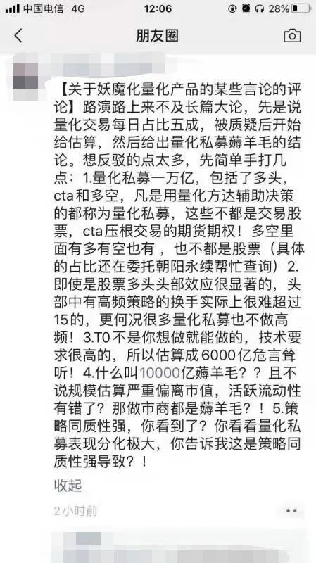 此言论一处,引发了资管机构特别是量化基金人士的疯狂吐槽,完全不真实,不专业,高估量化痕迹明显的观点随处可见。