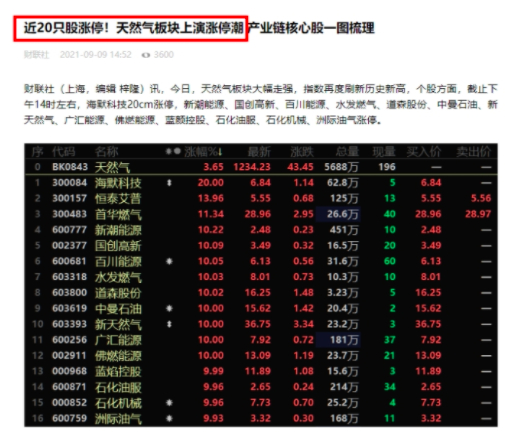 在全球天然气价格持续暴涨的大背景下,拥有气田资源的天然气上市公司在周四带领天然气板块上演疯狂涨停潮,在领涨龙头海默科技(300084)20CM涨停的刺激下,新潮能源(600777)、广汇能源(600256)、洲际油气(600759)、中曼石油(603619)、新天然气(603393)、蓝焰控股(000968)、ST中天(600856)、水发燃气(603318)、百川能源(600681)、佛燃能源(002911)、国创高新(002377)、阳煤化工(600691)、道森股份(603800)、石化油服(600871)、石化机械(000852)、中国化学(601117)中国神华(601088)等接近20家相关品种涨停!由此,天然气板块已经脱颖而出成为当前A股市场最强的热点风口!