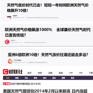 业内权威人士表示,德国逐渐退出核电,欧洲风电短缺,叠加货币宽松周期下工业经济带动用电需求复苏,导致电力紧张,碳排放期货价格上涨,天然气价格也跟着上涨。中国经济出口强,用电需求复苏,叠加国内碳中和计划火电供应不足,也推生天然气需求,导致天然气价格与欧洲相互推涨。