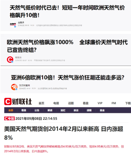 从全球视角来看,亚洲范围内,过去一年气价上涨超过6倍;美国天然气期货合约价格涨到了每百万英热单位4.2美元,是去年的两倍,也是十年来的最高点;欧洲则最为凶猛,气价在14个月内疯涨10倍。