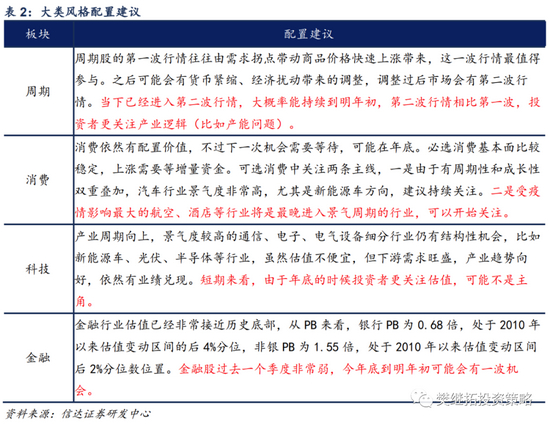 行业配置建议:大宗商品每一轮涨价一般持续2年多,背后原因主要是要等待新产能的建设投放,考虑到周期股的领先性,周期股可能能涨到年底或明年初,建议煤炭、钢铁、石油石化、种业等。金融股从绝对收益的角度已经进入价值区间,年底可关注相对收益的提升,特别是增量资金进来的时候,市场可能会出现类似2014年Q4的金融股暴动,目前逻辑认可度最高的是券商,建议最先关注,银行和地产的机会可能要等恒大事件落地。
