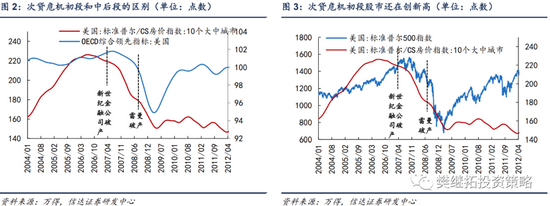 美国2008年的次贷危机大概可以分成两个阶段。第一阶段:危机出现阶段。2007年2月,汇丰银行宣布北美住房贷款按揭业务遭受巨额损失,次贷危机由此拉开序幕。2007年4月,美国第二大次级抵押贷款公司新世纪金融公司因无力偿还债务而申请破产保护。随后30余家美国次级抵押贷款公司陆续停业。此时美国房价已经开始下降,但从OECD经济领先指数来看,美国经济依然在继续上行,特别是很多上游商品的价格依然在继续上行,标普指数又继续涨了半年。