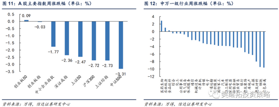 上周A股总体下跌,其中创业板50(0.09%)领涨。申万一级行业中,医药生物(2.90%)、农林牧渔(1.02%)、食品饮料(0.31%)领涨,有色金属(-9.62%)、钢铁(-9.46%)、建筑材料(-8.01%)领跌。概念股中,风力发电指数(13.25%)、黄酒指数(6.03%)、打板指数(4.36%)领涨,稀土指数(-10.78%)领跌。