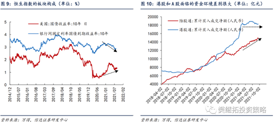 从资金环境来看,港股受海外利率影响更大。年初以来,美国利率中枢显著上移,而国内利率却不断下降。国内投资者通过港股通增配港股的资金最近半年几乎没有增长,而海外资金增配A股的速度一直比较稳定。