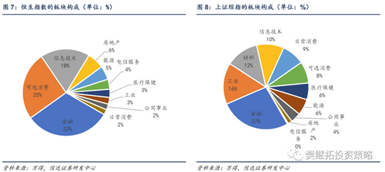 (3)港股调整较多,主要是源于投资者结构和板块构成的不同。3月以来,港股调整幅度较大,恒生指数跌幅超过20%,而A股明显强于港股,上证综指与2月的高点相差不大。背后很重要的原因是投资者结构和板块构成的差异,恒生指数中金融、消费和信息技术行业占比更高,均是今年景气度下行的板块,而上证综指中工业、材料等上游制造业景气度上行幅度较大。