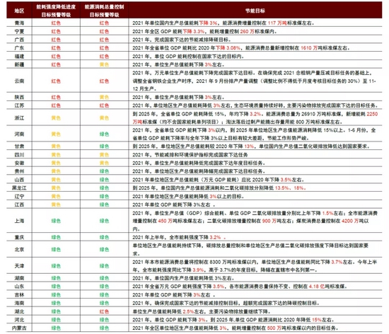 8月中下旬以来,部分地区在“能耗双控”目标的约束下大幅限产。按照2021年《政府工作报告》提出的目标,单位国内生产总值能耗需要降低3%左右。8月12日国家发改委发布《2021年上半年各地区能耗双控目标完成情况晴雨表》显示[1],能耗强度降低方面,青海、宁夏、广西、广东、福建、新疆、云南、陕西、江苏9个省(区)上半年能耗强度不降反升,为一级预警;浙江、河南等10个省上半年能耗强度降低率未达到进度要求,为二级预警。随后各地相继出台严格的限电限产举措,包括江苏、广东、云南、陕西等省,对化工、钢铁、有色金属、非金属建材等行业进行限产。