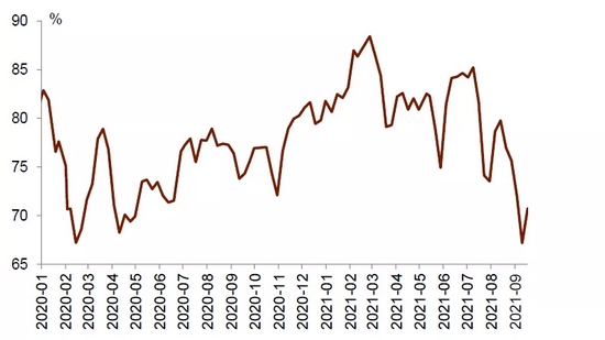 能耗双控下的行政限产,对短期工业生产可能形成一定影响。上半年能耗强度不达标的省份,合计占我国工业增加值的70%左右,其中红色预警和黄色预警的省份,分别占比约38%和32%。尤其是近期出台政策较为严格的广东和江苏两个工业大省,各占全国工业规模的10%以上。近期的高频数据显示,金属冶炼、化工、燃料加工、非金属建材等高耗能行业,生产受到政策的明显约束。比如全国钢铁周产量、全国PVC开工率、华东地区焦炉开工率、江苏等省的水泥开工率均显著回落。