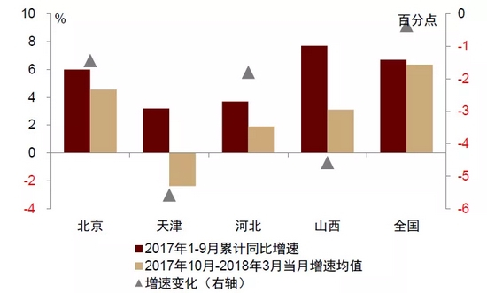 图表8:2017年首次秋冬季限产,京津冀晋四省市工业生产平均降幅比全国大约3个百分点