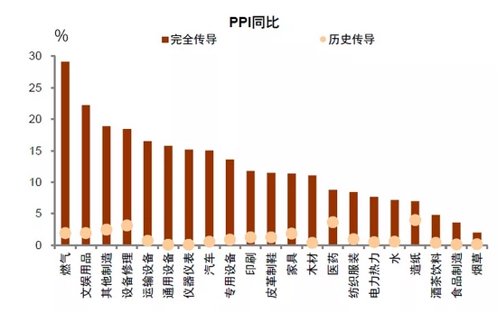 资料来源:万得资讯,中金公司研究部。图中推算的历史传导是按照前述供给承压行业的历史传导情况测算的各行业价格涨幅与8月PPI同比之差。完全传导是按照完全消耗系数推算的各行业价格涨幅与8月PPI同比之差
