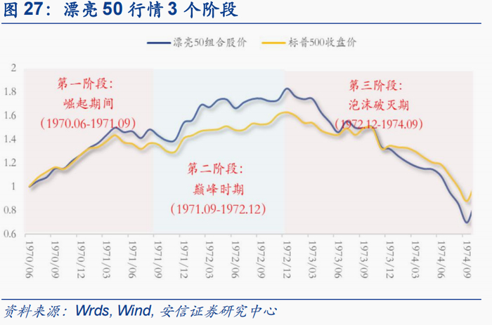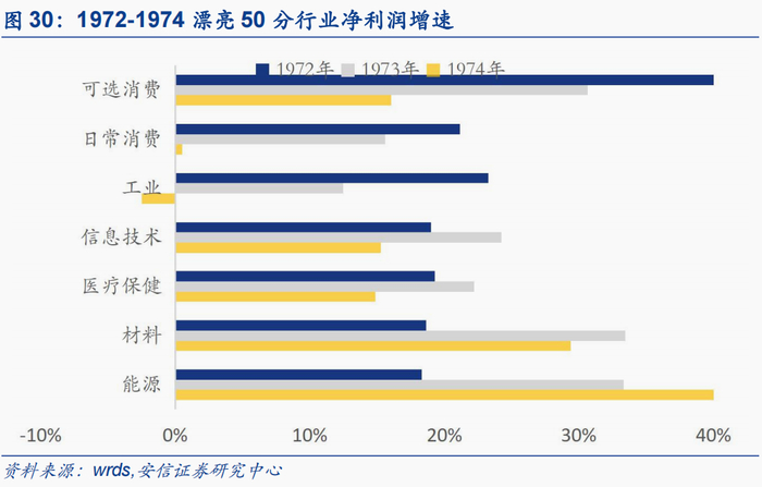■市场表现上,漂亮50先崛起后破灭,其中可选消费业绩下滑是主要因素。漂亮50行情分为三个阶段:1)1970-1972年崛起并达到巅峰,宏观层面源于通胀率71年开始下降明显、取消汽车购置税、居民消费大幅增长,带动GDP大幅上行,产业逻辑上、行业集中度提升,经济结构上,非耐用消费品,批发零售业利润增速23.5%。2)主要下跌段发生在1973-1974 年,行情终止于宏观系统性风险。1973-1974年无风险利率重新抬头,至1973年7月,国债收益率再次突破7%,此后随着石油危机的爆发通胀加速上行,宏观经济增速出现拐点,居民可支配收入也大幅下降,进一步使得可选消费增速大幅下滑(图26、图27)。