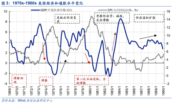 回顾20世纪70-80年代,美国先后经历了两次石油危机和一次粮食危机,供给短缺叠加货币政策缺乏独立性进一步推高通货膨胀预期深陷滞胀泥潭,80年代里根政府通过减税、放松管制、削减非国防开支、反通胀政策四大政策带领美国经济走出滞胀,美国经济政策目标由解决有效需求不足转向反通胀和供给结构调整。