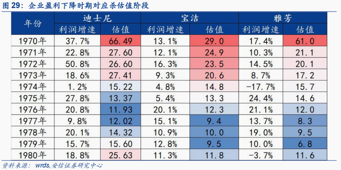 因此,消费股退潮时期(74-80年),一方面利率上行对应的估值出现明显下降,另一方面美国经济进入滞胀期后,整体经济增速大幅放缓,漂亮50整体业绩平均增速也下了一个台阶,从71-72年的平均40%的增速下降到20%左右的增速水平(末期下降至10%左右的增速)。糟糕的经济(高通胀引发大家对消费力不足的预期)及不断下滑的利润增速使得投资者预期也十分悲观,进而使得消费股估值水平大幅下杀。