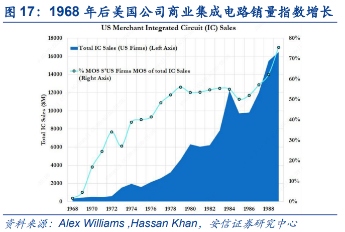 半导体推动集成技术进步,大规模、超大规模集成电路面世,市场规模大幅提升。大规模生产计算机最初也与半导体的发展有着某种共生关系,其对芯片的需求推动了封装、集成技术的进步,1959年,仙童半导体公司的Robert Noycy发明了平面工艺技术,使得集成电路可量产化,从此半导体 从“发明阶段”进入了“商用阶段”。1965年,Gordon Moore提出摩尔定律:当价格不变时,集成电路上可容纳的元器件的数目,约每隔18-24个月便会增加一倍,性能也将提升一倍。1967年,大规模集成电路出现;1977年,超大规模集成电路面世,一个硅晶片中可集成15万个以 上的晶体管,1968至1988这20年间, 美国集成电路市场规模由不到20亿增长至接近180亿美元,增长近9倍。