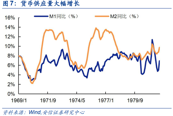 前期激进的财政扩张和信贷扩张积聚通胀风险:20 世纪 60 年代-80 年代,美国经济始终处于高通胀的阴霾之下,由于越战产生了大量军费开支,美国从 1961 年开始成为长期财政赤字国,之后财政赤字进一步高筑,叠加前期的信贷大幅扩张,高通胀的泡沫逐步积累。1970 年在尼克松新政的约束下,CPI 同比从年初 6.2%的高位回落至 1972 年 6 月的 2.7%,但仍在相对高位,通胀重新上行的压力始终存在。