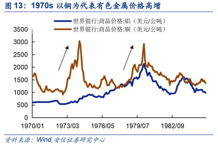1970s滞胀期间,周期股随能源价格走高而大幅上行并先于大宗商品价格回落。伴随着石油危机和粮食危机的出现,不仅仅是原油价格高涨,大宗商品价格均出现不同程度上涨,在第一次(1973.10-1974.12)和第二次石油危机(1978.12-1980.12)中,黄金价格分别上涨83.6%、159%,铜价跟随石油价格飙升分别最高上涨46.8%、90.4%, 煤价在所有大宗商品中滞后上涨,最高分别上幅133.8%、87.4%。商品价格的上涨进一步推高了通胀同时也抬升周期股的收益,根据Kenneth R. French公开的美股全市场30个子行业的收益率数据,经计算发现,1974年美国CPI同比上升30.9%,而石油和有色股上涨54%和32%存在超额收益。后续来看,周期股价格可能先于大宗商品价格回落,1981-1982年美股周期股全线回落,煤炭股价格累计下行37.4%,但煤炭价格仍继续上涨并于1982年见顶,相较1978年上涨2倍。